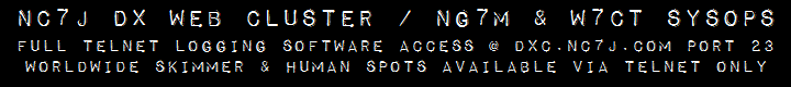 | Please switch and start using logging software telnet connections. Telnet to 'dxc.ng7m.com:7373' (port 7373) and login with your callsign. See connection details below and ARC6 cluster manual below. Skimmer Server Spots only available via NG7M telnet connections. |